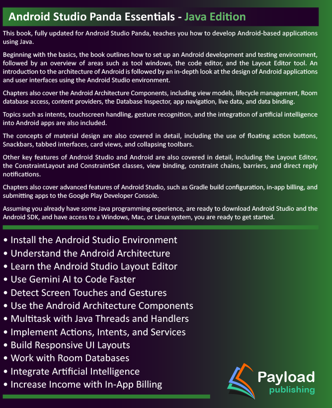 This book, fully updated for Android Studio Panda, teaches you how to develop Android applications using Java.