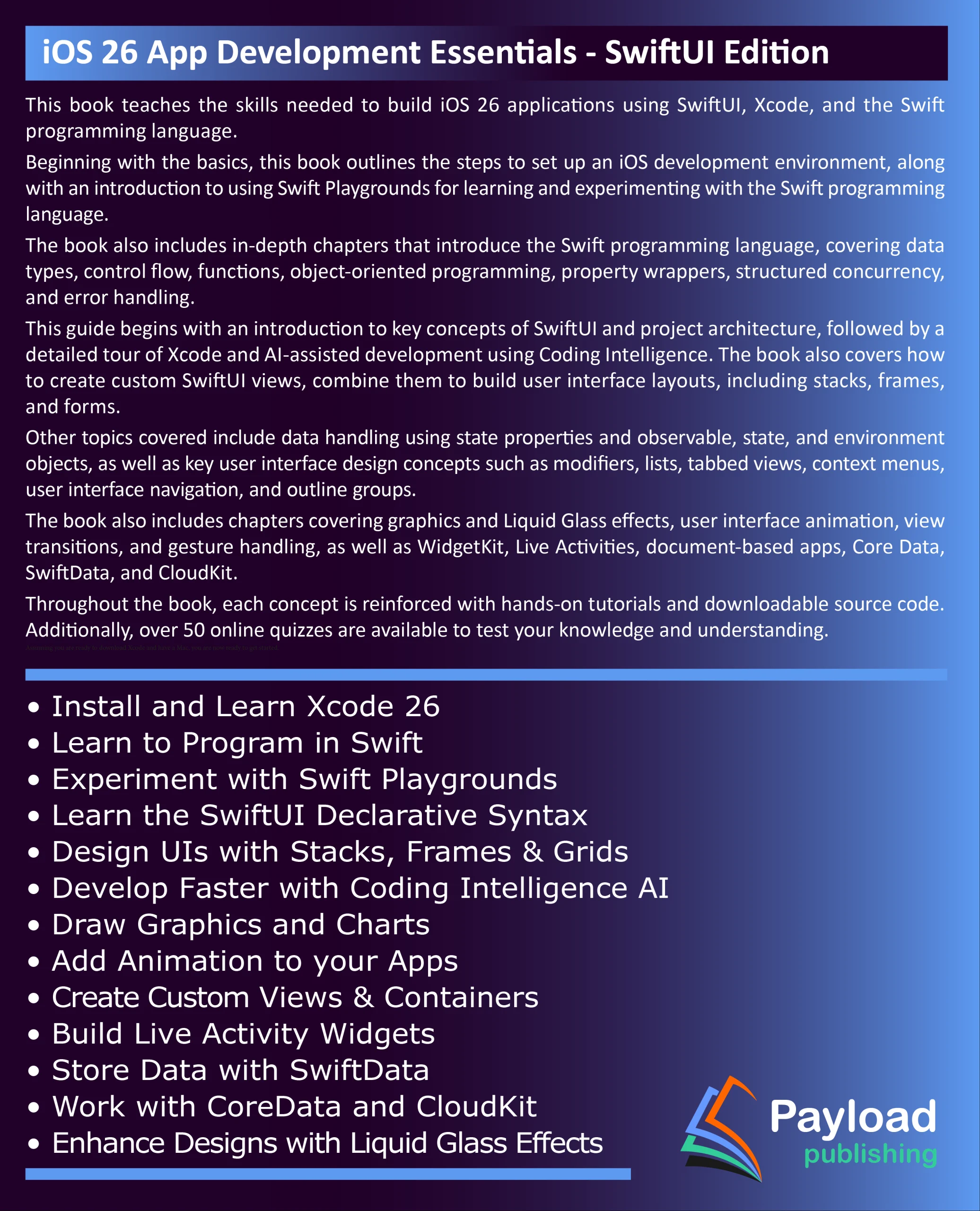 This book teaches the skills needed to build iOS 26 applications using SwiftUI, Xcode, and the Swift programming language.